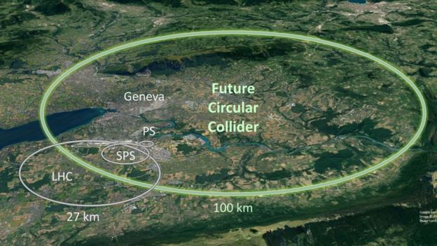 27-километровый туннель коллайдера ЦЕРН, расположен в 100 метрах под землей недалеко от Женевы.