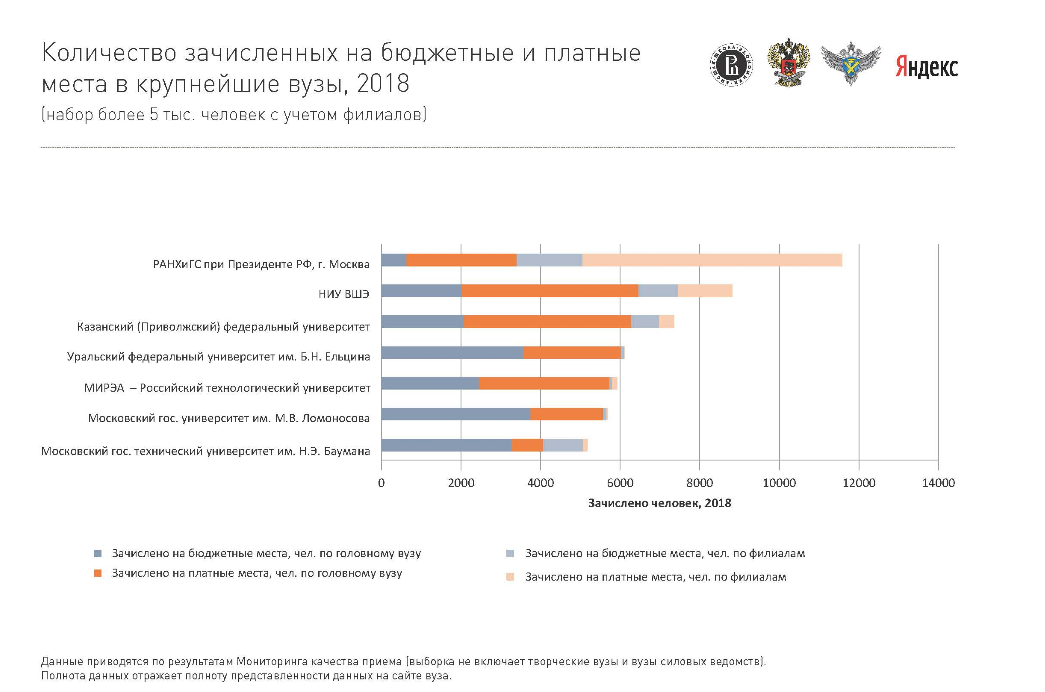 В 2018-2019 гг., как сообщает «Российская газета», количество бесплатных мест для бакалавров и специалистов было увеличено с 298000 и 70000 до 315000 и 75000 соответственно.
