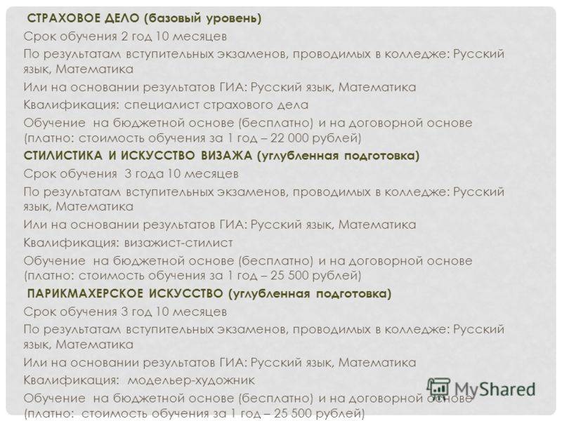 Зачисление в колледжи проводится без экзаменов, по конкурсу аттестатов. Поэтому, если не удалось пройти вузовский отбор по русскому, математике и обществознанию, можно освоить специальности СПО того же профиля, а потом снова попробовать получить высшее образование, причем с сокращением срока обучения.