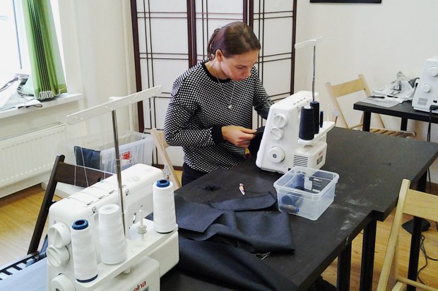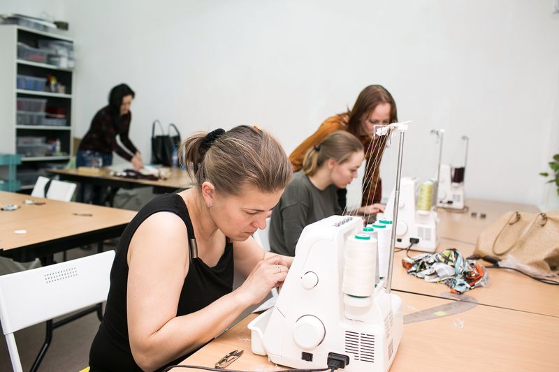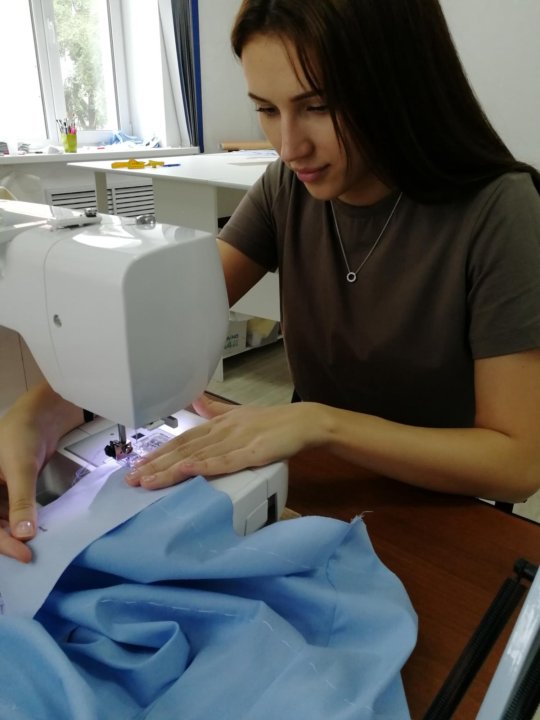На занятиях каждый работает за персональной машинкой.В классах есть всё необходимое: сантиметры, ножницы, портняжные линейки, бумага для построения лекал и другие швейные мелочи.