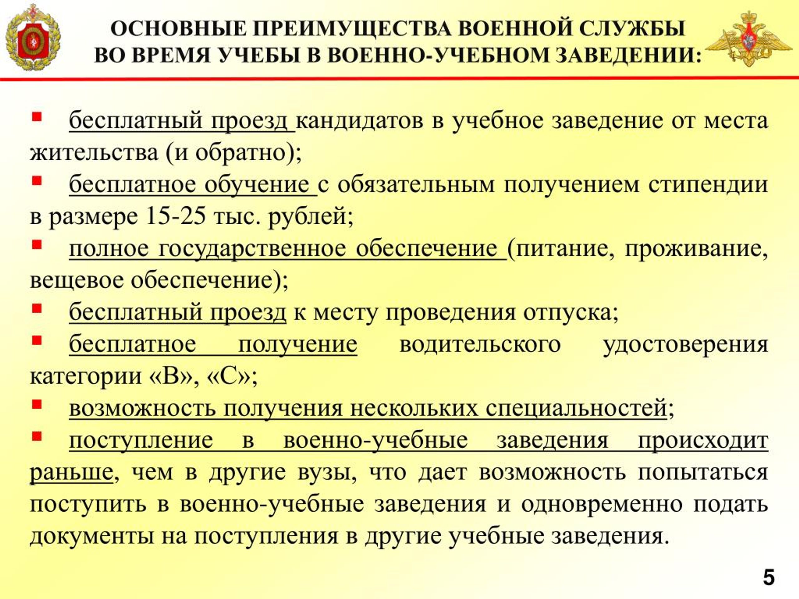 Но в то же время лицо, «отдавшее долг родине», имеет небольшие привилегии: еще будучи в армии индивид может подать документы в военное училище. Более того, демобилизованному абитуриенту предоставляются определенные льготы, которыми он может воспользоваться даже по истечении нескольких лет.