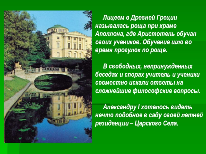 Здесь, в Царском Селе он провёл шесть необыкновенных лет. Первый Лицей появился в Древней Греции. Так называлась роща при храме Аполлона, где Аристотель обучал своих учеников. Александр-C3 8E E2 84 A2 хотел видеть нечто подобное в саду своей летней резиденции C3 A2 E2 82 AC E2 80 9C Царском Селе.