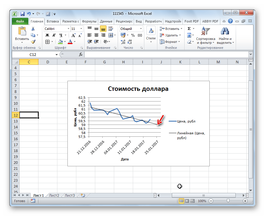 или «Экспоненциальное приближение». - Линия тренда добавлена, но она полностью находится под линией самого графика, так как мы не указали значение аргумента, к которому она должна стремиться. Чтобы это сделать опять последовательно кликаем по кнопке «Линия тренда», но теперь выбираем пункт «Дополнительные параметры линии тренда».