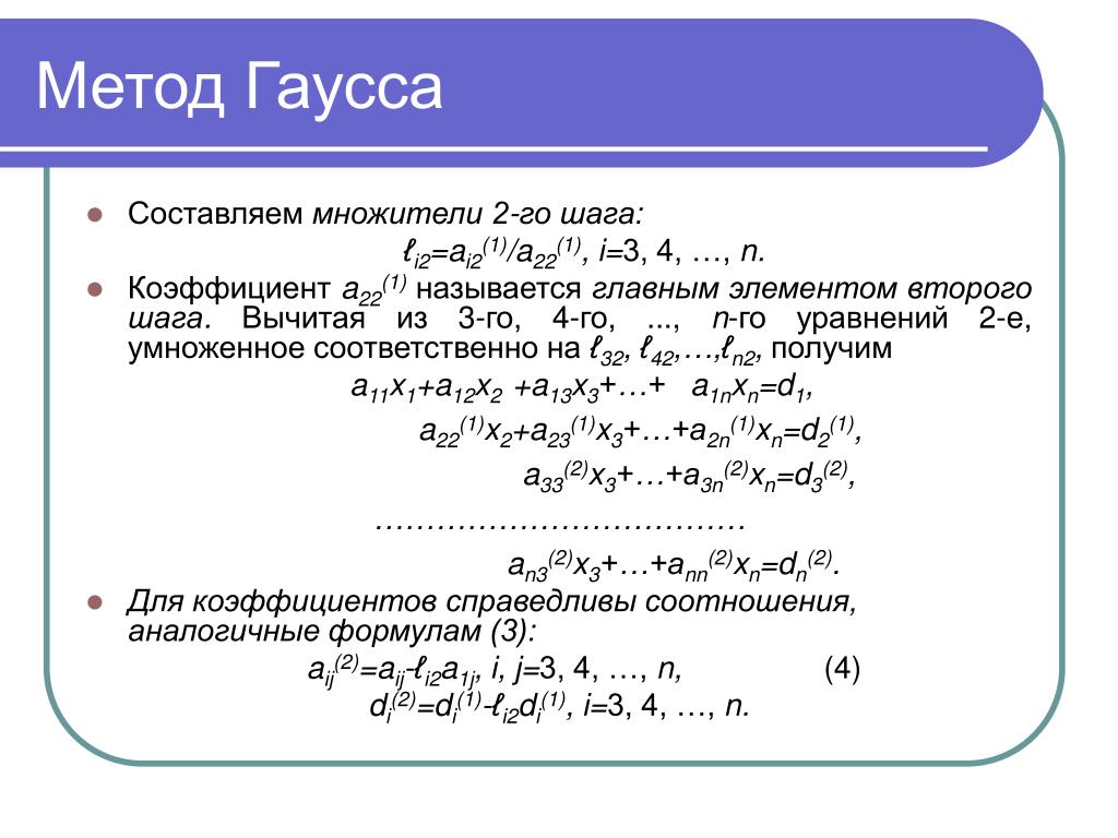 В основе метода лежит идея последовательного исключения неизвестных. Метод состоит из двух этапов. На первом этапе (прямой ход) система при помощи последовательного исключения неизвестных приводится к треугольному виду. На втором этапе (обратный ход) из системы треугольного вида последовательно, в обратном порядке, начиная c n-го уравнения, находятся неизвестные системы.