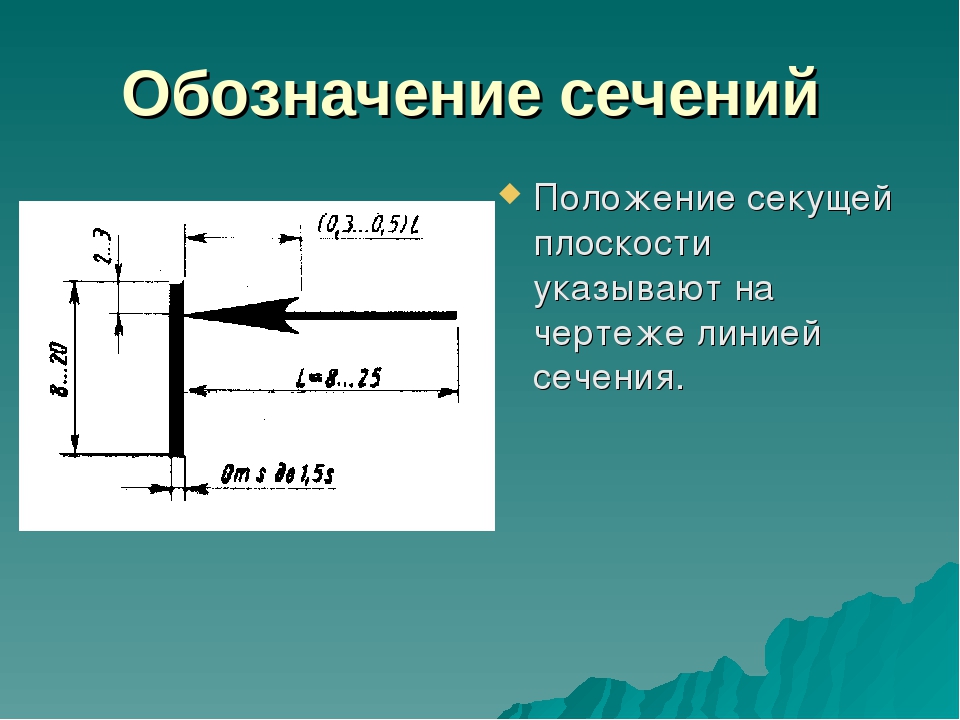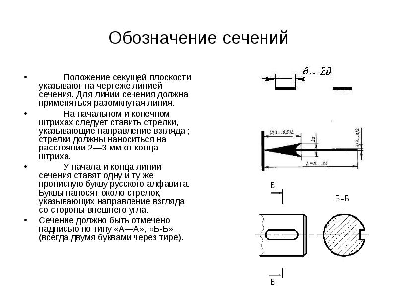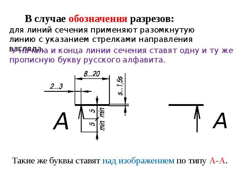 По ГОСТ 3453-59 на сложных разрезах, а также на простых разрезах, когда след секущей плоскости не совпадает с осью симметрии вида, след секущей плоскости, называемый линией сечения, должен отмечаться штрихами в начале, в местах излома и в конце линии разреза. На начальном и конечном штрихах следует ставить стрелки, указывающие направление взгляда. Начальный и конечный штрихи не должны пересекать контур соответствую-