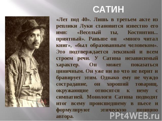 Сатин в пьесе М. Горького «На дне» является идей-ным противником Луки. Хотя именно старик привел его к размышлениям, Сатин придерживается других прин-ципов и поднимает на недосягаемую высоту мысль о ценности человека: «Человек — свободен!» Если Лука выдвигает теорию о том, что люди ценны не сами по себе, а как материал для лучшего, Сатин сумел пойти дальше в своих рассуждениях: «Все — в человеке, все для чело-века! Чело-век! Это — великолепно! Это звучит… гордо!.. Надо уважать человека! Не жалеть… не унижать его жалостью… уважать надо!»