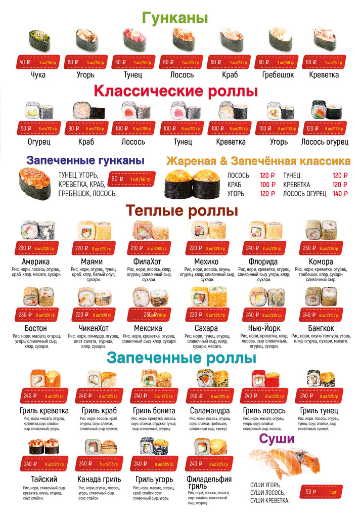 Ролл №1 – Мафия: Ролл с угрем, лососем, икрой тобико, сурими кимчи, сыром Филадельфия, авокадо, огурцом, кунжутом, соусами унаги и манго-чили Ролл №2 – Филадельфия Сякэ: Классический ролл с лососем, сыром Филадельфия, икрой тобико, авокадо и огурцом Ролл №3 – Зеленый дракон: Ролл с угрем панко, сыром Филадельфия, Тамаго, огурцом, авокадо, кунжутом и соусом унаги Ролл №4 – Филадельфия Сякэ с манго: Ролл с лососем, сыром Филадельфия, манго и соусом манго-чили Ролл №5 – Огненный дракон: Ролл с карамелизированным лососем, сыром Филадельфия, дор блю, грушей, Тамаго, икрой тобико и соусом манго-чили Ролл №6 – Токусан: Ролл с лососем, угрем, сыром Филадельфия, Тамаго, огурцом, сурими, соусом унаги и спайси гедза Ролл №7 – Золотой дракон: Ролл с угрем и жареным лососем, сыром Филадельфия, Тамаго, сладкими шиитаке, огурцом, кунжутом и соусом унаги Ролл №8 – Унаги Рору: Ролл с угрем, сурими кимчи, сыром Филадельфия, огурцом, Тамаго и соусом унаги Соусы Манго-чили и Хойсин