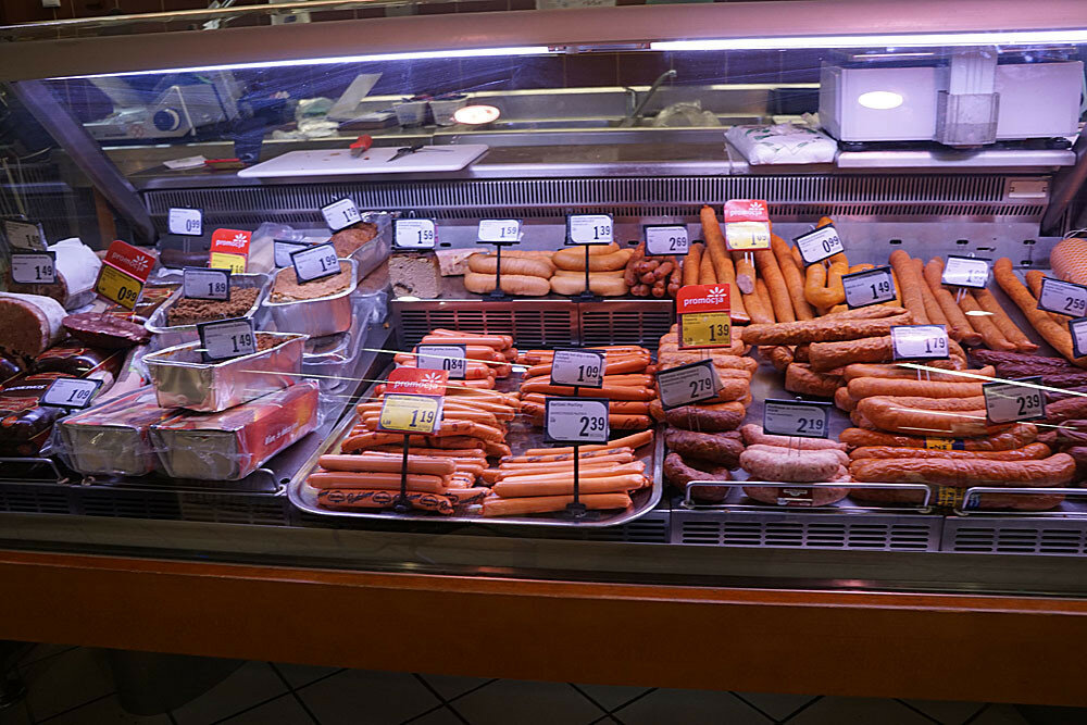 К выбору и качеству свежего мяса тоже претензий нет. Есть птица (курица, индюшатина, утка и т.п.), свинина, говядина. Либо на вес на прилавках, либо в ваккумных упаковках-лоточках (ножки, грудки, стейки, вырезки, гуляш и т.п.). Большой выбор фаршей. Мы, правда, готовые почти не берем, а просим в магазине «змелить» понравившийся кусок мяса — так вкуснее! Еще мясо могут для вас отбить на специальной машине прямо в магазине, дома так хорошо не получится