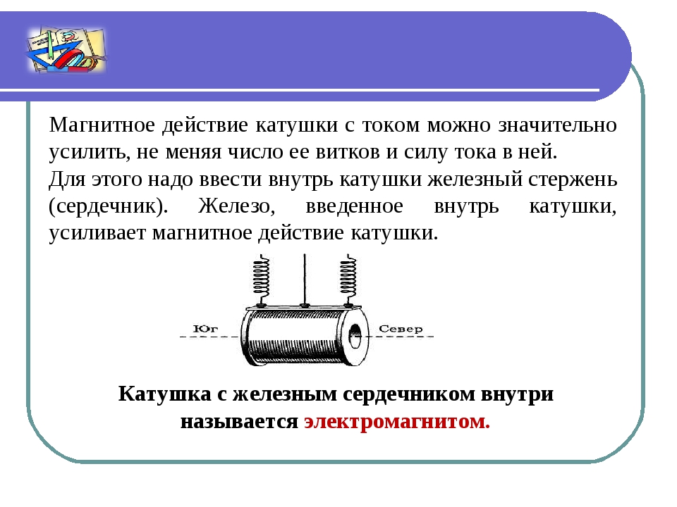 Электромагниты – это туго намотанные на каркас витки провода, обычно с железным сердечником, который действует как постоянный магнит только тогда, когда по проводу течет ток. Сила и полярность магнитного поля, создаваемого электромагнитом, обусловлены изменением величины и направления электрического тока, текущего по проводу.