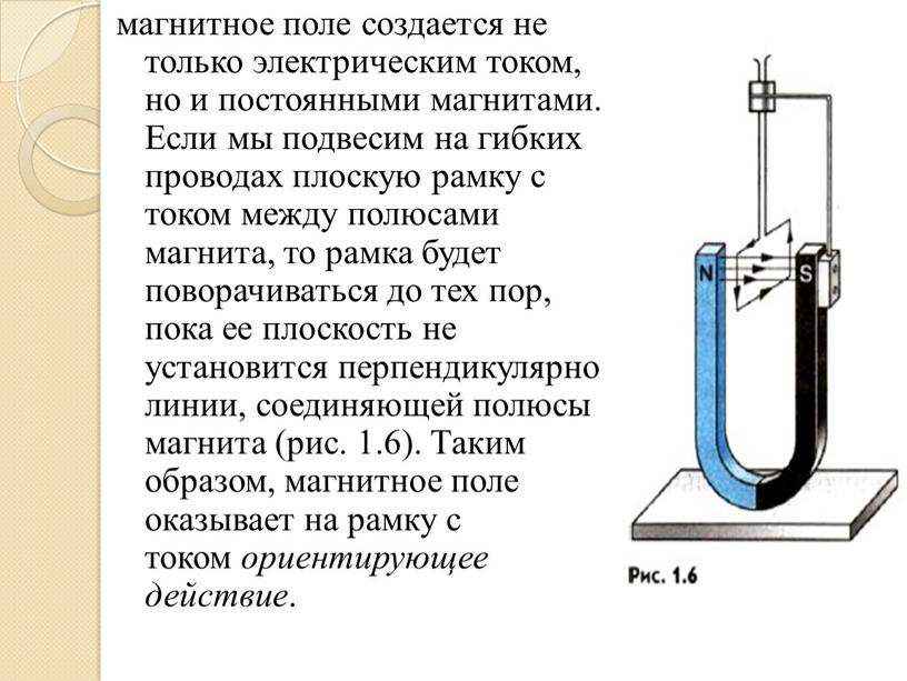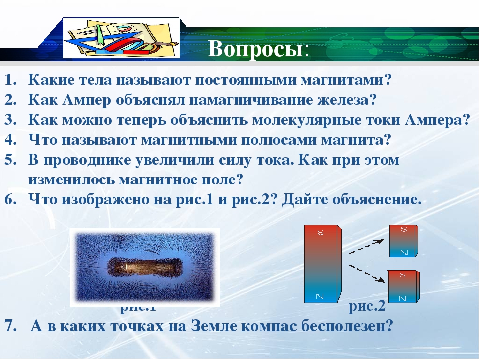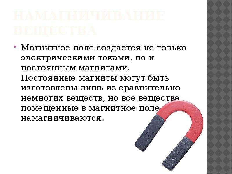 Магниты – это тела, обладающие способностью притягивать железные и стальные предметы и отталкивать некоторые другие благодаря действию своего магнитного поля.Магнитное поле постоянных магнитов создается электрическими микротоками, циркулирующими внутри молекул вещества (гипотеза Ампера).