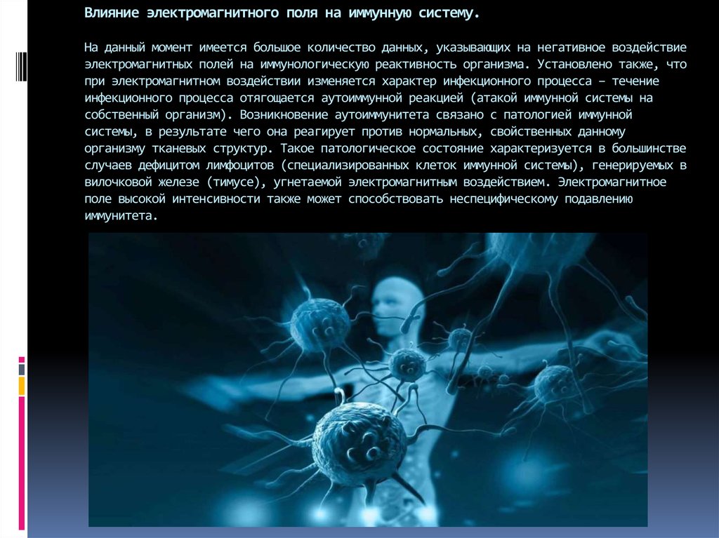 Влияние электромагнитных полей высокой интенсивности проявляется в угнетающем эффекте на Т-систему клеточного иммунитета. Под действием ЭМП увеличивается выработка адреналина, активизируется свертываемость крови, снижается активность гипофиза.