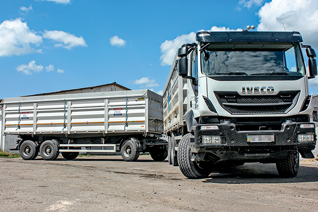 Зерновой прицеп Wilson и AM General M-915, бывший армейский магистральный трактор, готовы перевезти собранное зерно на хранение. С этой установкой еще один Уилсон, прицепленный к трактору International 9200.