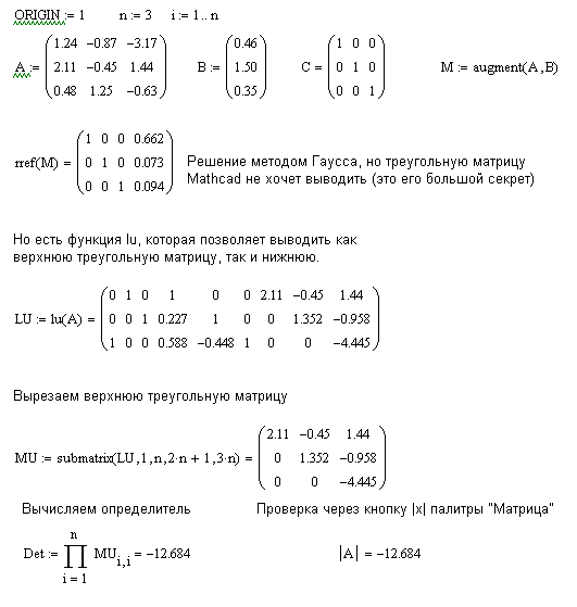 Вычисление определителя матрицы заключается в выполнении над матрицей алгоритма Гаусса для решения систем линейных алгебраических уравнений. В результате выполнения алгоритма получаем диагональную матрицу, её определитель равен произведению элементов, стоящих на диагонали.