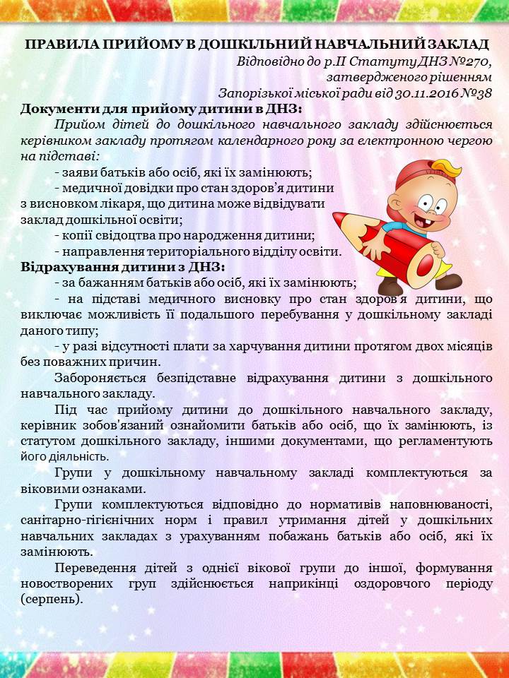 «Санітарний регламент для дошкільних навчальних закладів», затверджений наказом МОЗ від 24.03.2016 №234;