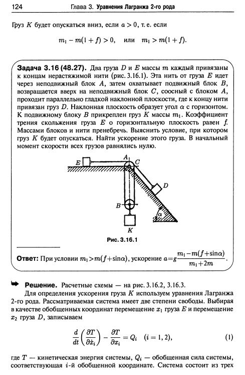 То, как системы координат соотносятся друг с другом, влияет на уравнение связи. Так, например, если бы вместо этого мы выбрали нисходящее направление в качестве +\(y\)-направления для блока № 2 (но оставили положительное направление вверх для другого блока), тогда не было бы необходимости в знаке минус в ограничении уравнение – положительные перемещения одного блока соответствуют положительным перемещениям другого блока. Мы видим, что поэтому нет «правильного» выбора системы координат, но мы должны позаботиться о том, чтобы, когда придет время комбинировать уравнения из двух FBD, уравнения ограничений правильно связывали переменные.Еще более яркий пример выбора системы координат мы увидим в следующем примере.