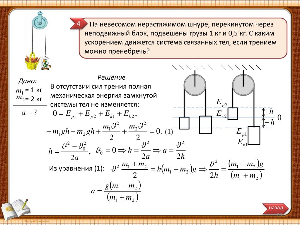 То есть действительно лабораторную систему можно считать инерциальной, а согласно условию – и консервативной. Поэтому на основании закона сохранения механической энергии можно утверждать, что приобретенная системой к моменту времени t кинетическая энергия равна убыли ее потенциальной энергии, обусловленной опусканием груза на высоту h. Очевидно, возможные перемещения груза малы по сравнению с радиусом Земли, а потому действующую на груз силу тяжести mg необходимо считать постоянной. Тогда из сказанного следует, что в любой допустимый по условию задачи момент времени t должно иметь место соотношение