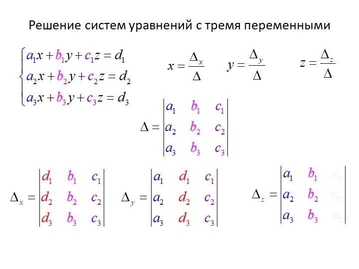 Если , то система имеет единственное решение, и для нахождения корней мы должны вычислить еще два определителя: