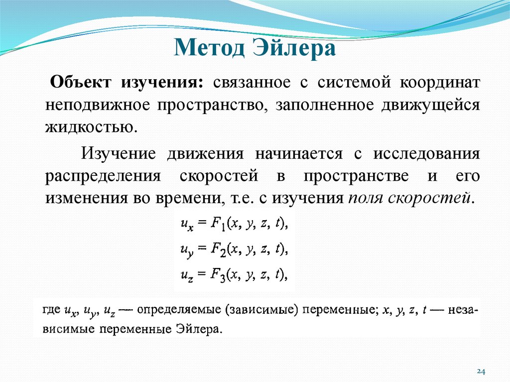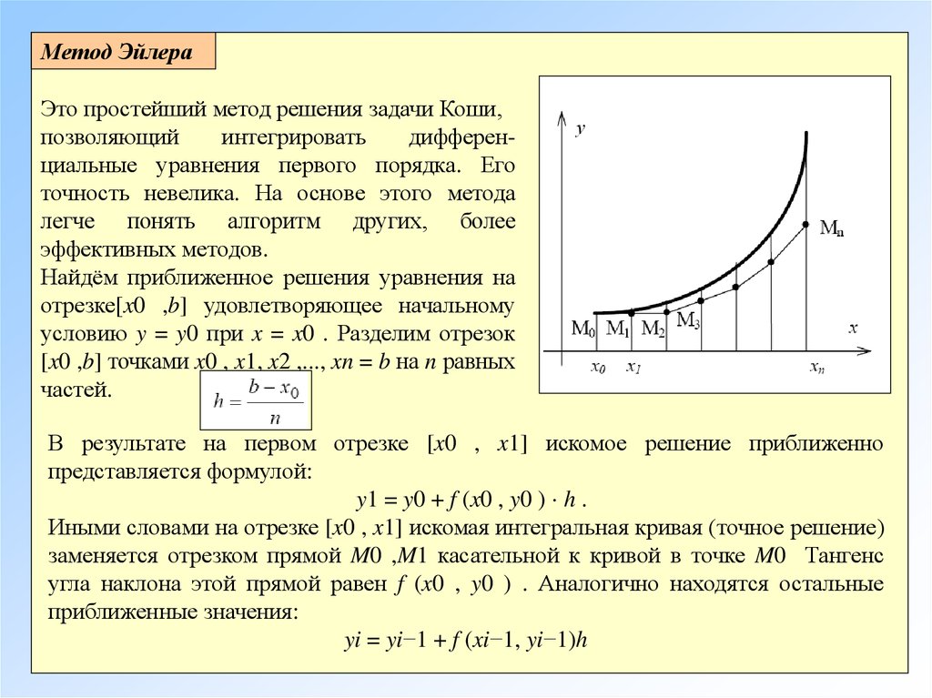 Простейшим из численных методов решения дифференциального уравнения является метод Эйлера. В его основе лежит идея графического построения решения дифференциального уравнения, однако этот метод дает одновременно и способ нахождения искомой функции в численной форме или таблицы.