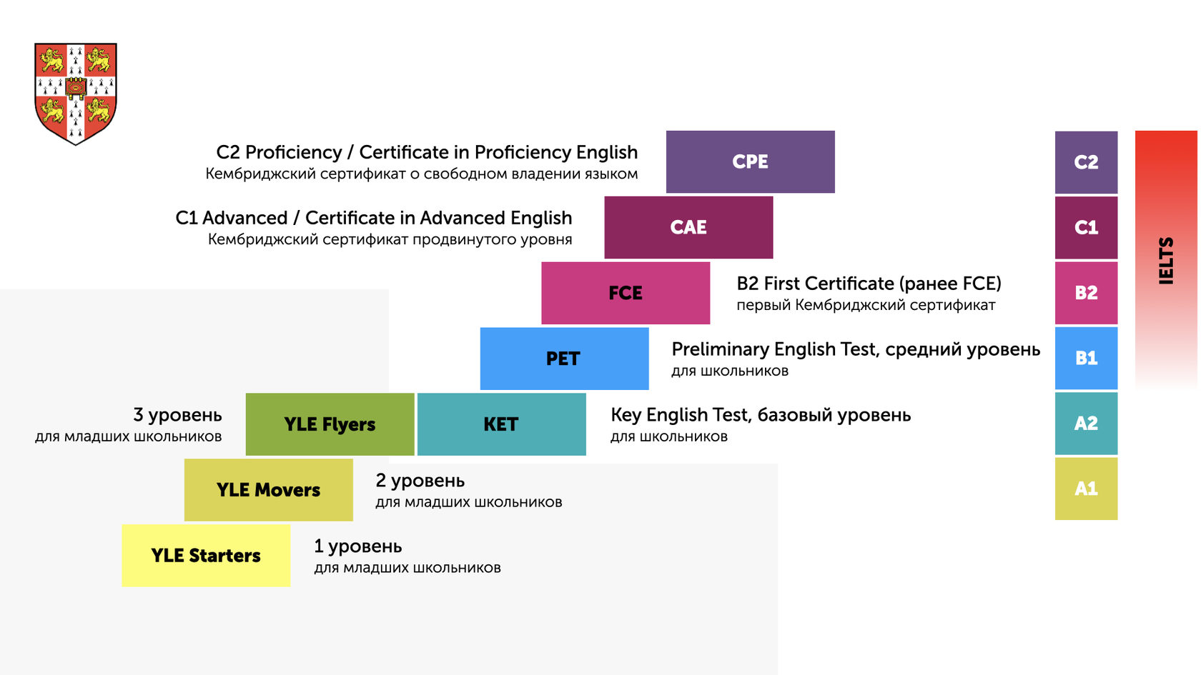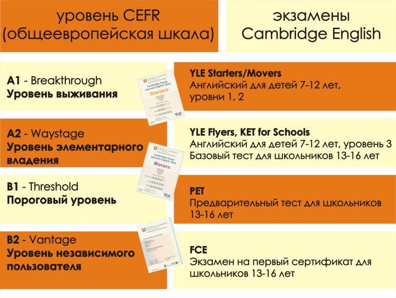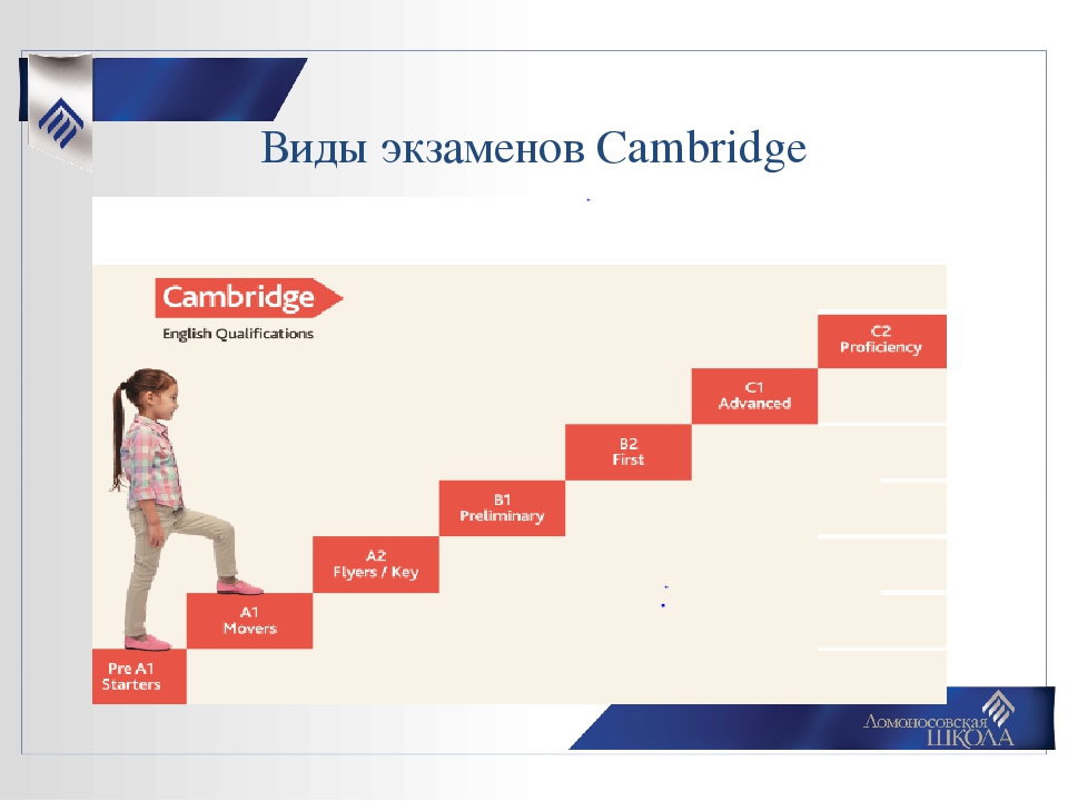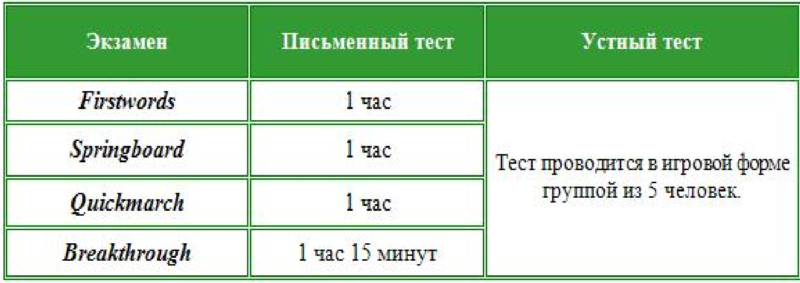 Существует три теста, основанных на деятельности – Starters , Movers и Flyers .Это дает студентам четкий путь к повышению уровня владения английским языком.