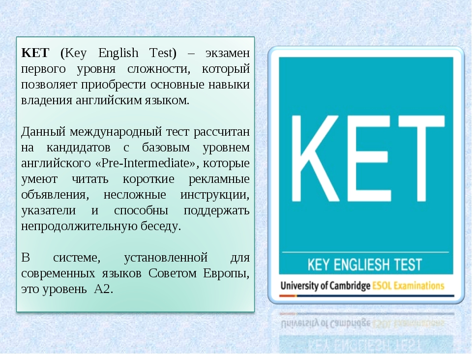 С 4-го и 5-го классов мы представляем нашим ученикам Key English Test (KET) . Это экзамен по общему английскому языку самого низкого уровня в диапазоне Кембриджского английского.Это показывает, что вы можете общаться на базовом английском в повседневных ситуациях. KET для школ находится на том же уровне, что и KET для взрослых, и дает точно такой же международно признанный сертификат. Единственное отличие состоит в том, что содержание экзамена ориентировано на интересы и опыт школьников.