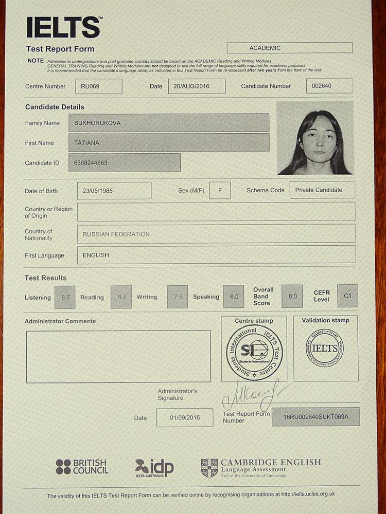 После прохождения и проверки экзамена вы получаете сертификат, на котором отдельно написаны баллы за все четыре секции и подсчитан ваш средний показатель. Баллы IELTS могут быть половинными, подробнее о критериях оценки теста можно прочитать здесь.
