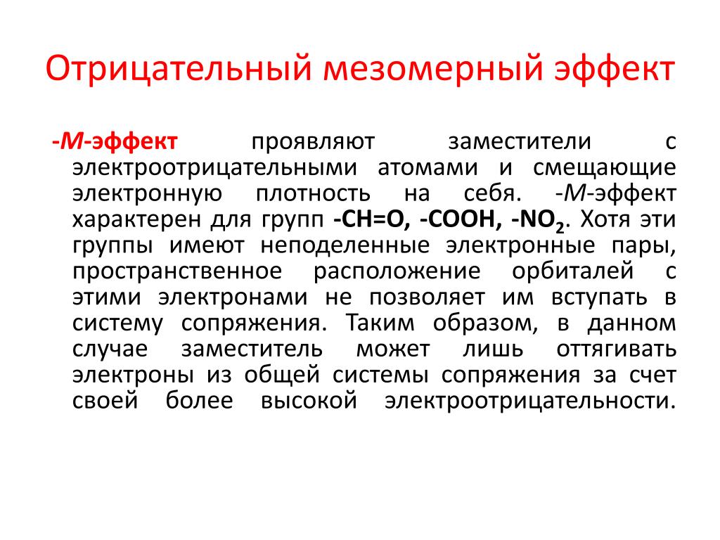 –М-эффект проявляют заместители, содержащие электроотрицательные атомы и понижающие электронную плотность в сопряженной системе. Такими свойствами обладают