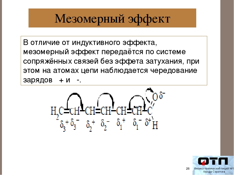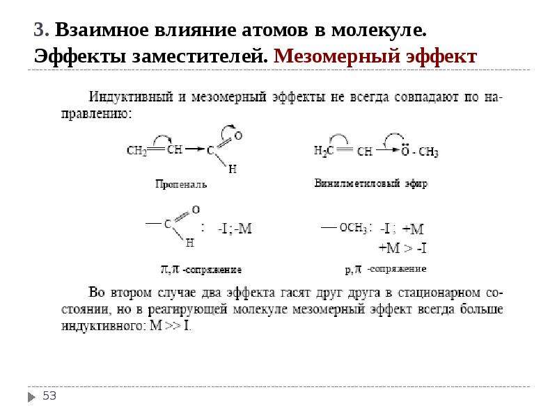 3) Мезомерный эффект объясняет перераспереление электронной плотности в молекуле, а значит позволяет отследить формирование реакционных центров, что бесценно для понимания органической химии.