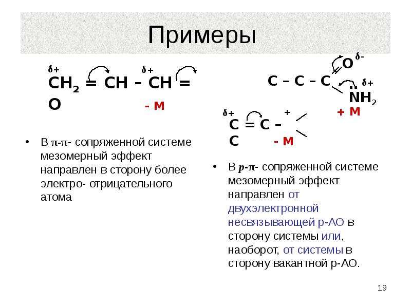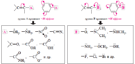 Направление смещения электронной плотности под влиянием М-эффекта обозначается изогнутыми стрелками.