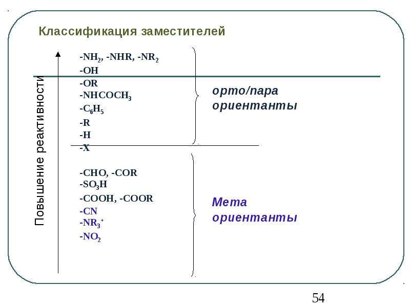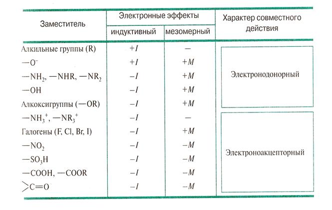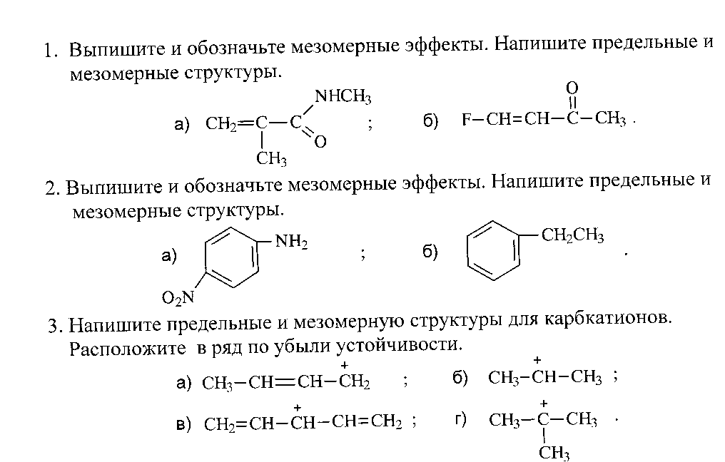 2) Мезомерный эффект нередко “вступает в противоречие” с проявляемым группами индуктивным эффектом, и в каждом конкретном случае необходимо быть внимательным к тому, какой эффект окажется сильнее.