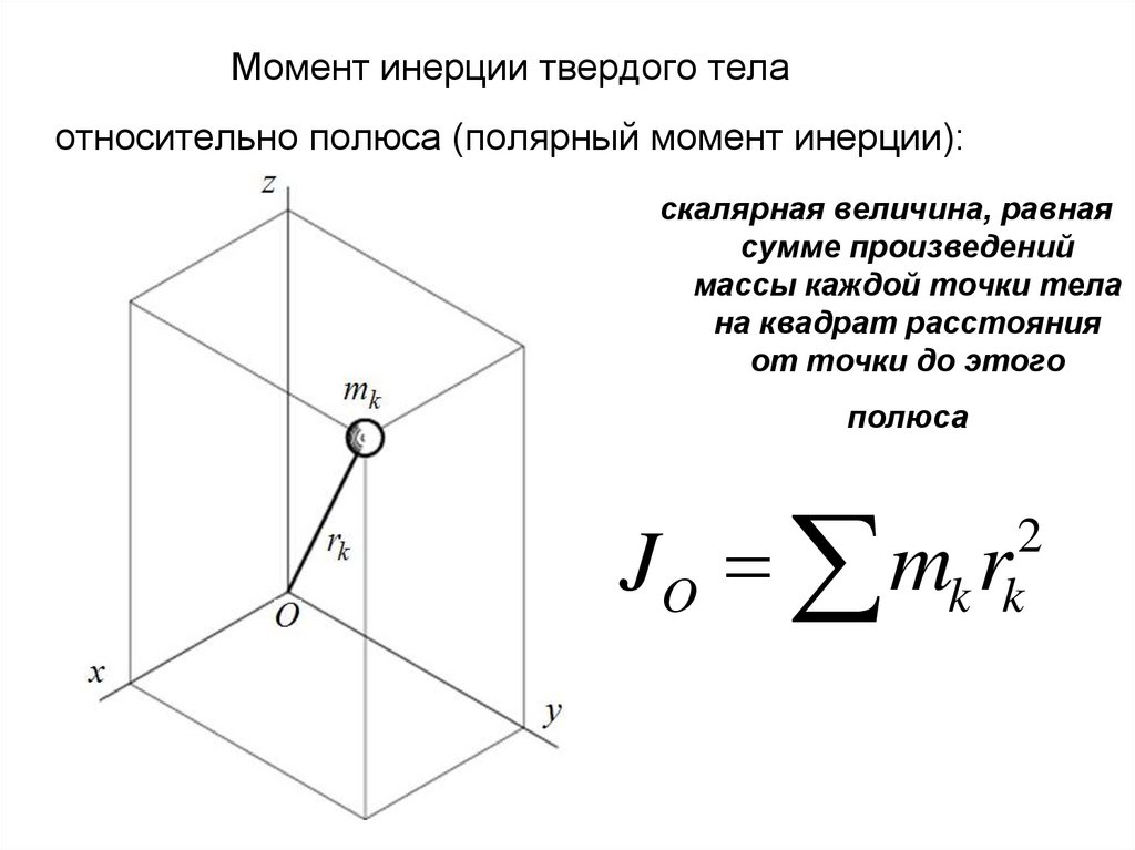 Характеризуется распределением масс в теле: момент инерции равен сумме произведений элементарных масс на квадрат их расстояний до базового множества (точки, прямой или плоскости).