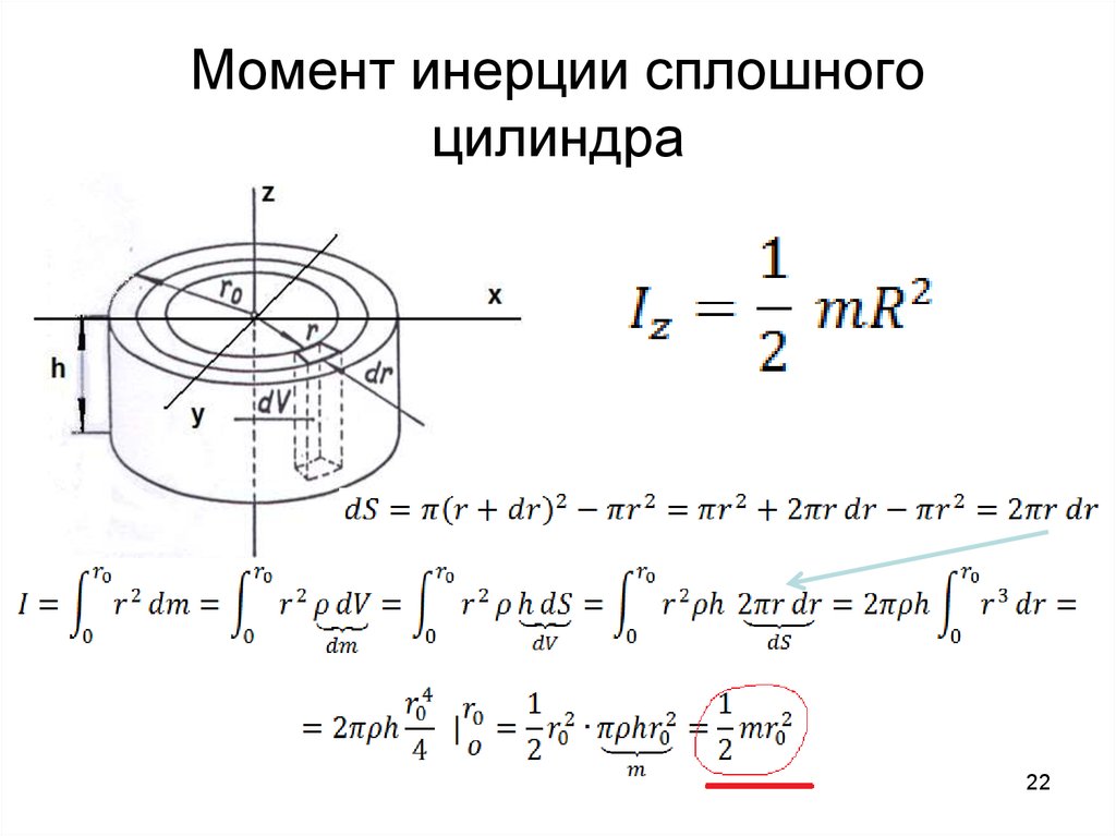 .Эта же формула справедлива для момента инерции сплошного цилиндра относительно оси совпадающей с осью цилиндра..