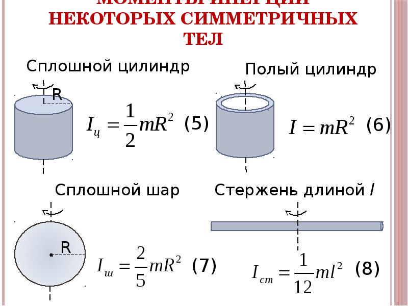 МОМЕНТЫ ИНЕРЦИИ НЕКОТОРЫХ ТЕЛ [c.146]Воспользовавшись общей формулой (1.209), выведем формулы моментов инерции некоторых тел. [c.146]