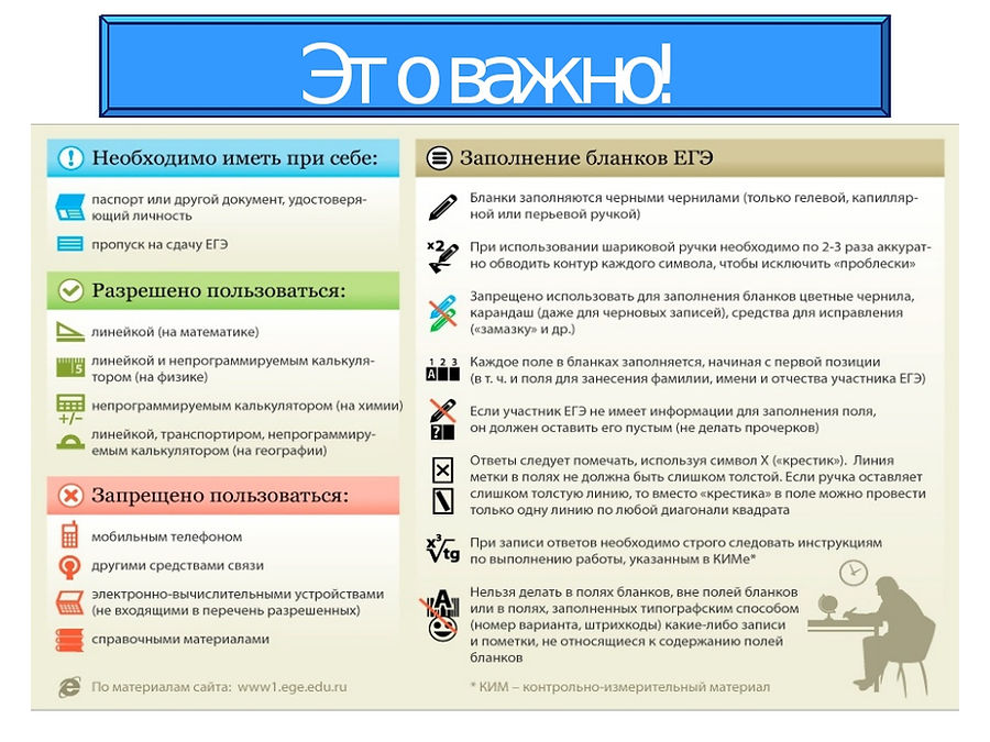 На экзамен нужно взять с собой бутылку воды, шоколадку. Обязательно иметь черную гелевую ручку, необходимую для заполнения бланка ответов, паспорт для прохождения регистрации на экзамен.