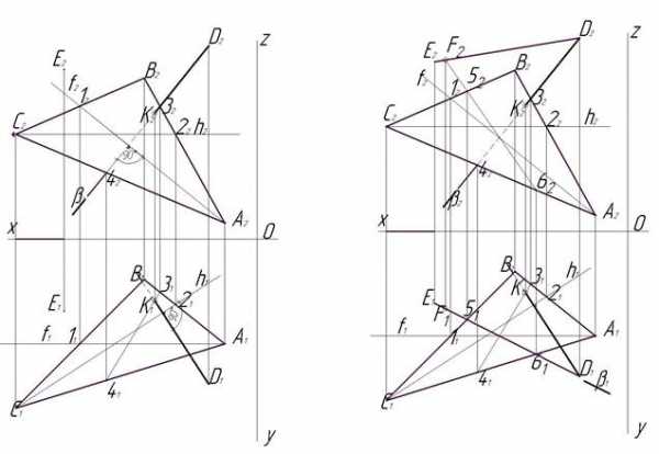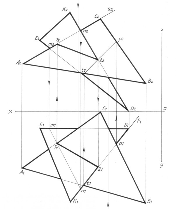 Что это такое?!…Это инструмент, который просто одним нажатием позволяет удалить часть отрезка или кривой. Вот, например, у нас есть контуры пересекающихся треугольников (рис.5.5), нам нужно удалить части сторон (выделены красным), для этого заходим в инструментальную панель “редактирование” — ”усечь кривую”, левой кнопкой мыши указываем отрезки, и они удаляются автоматически. Может быть сейчас Вам еще непонятно чем он сможет вам помочь, но если им пользоваться, это может существенно экономить ваше время на выполнение эпюр.