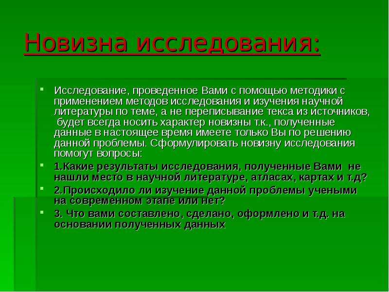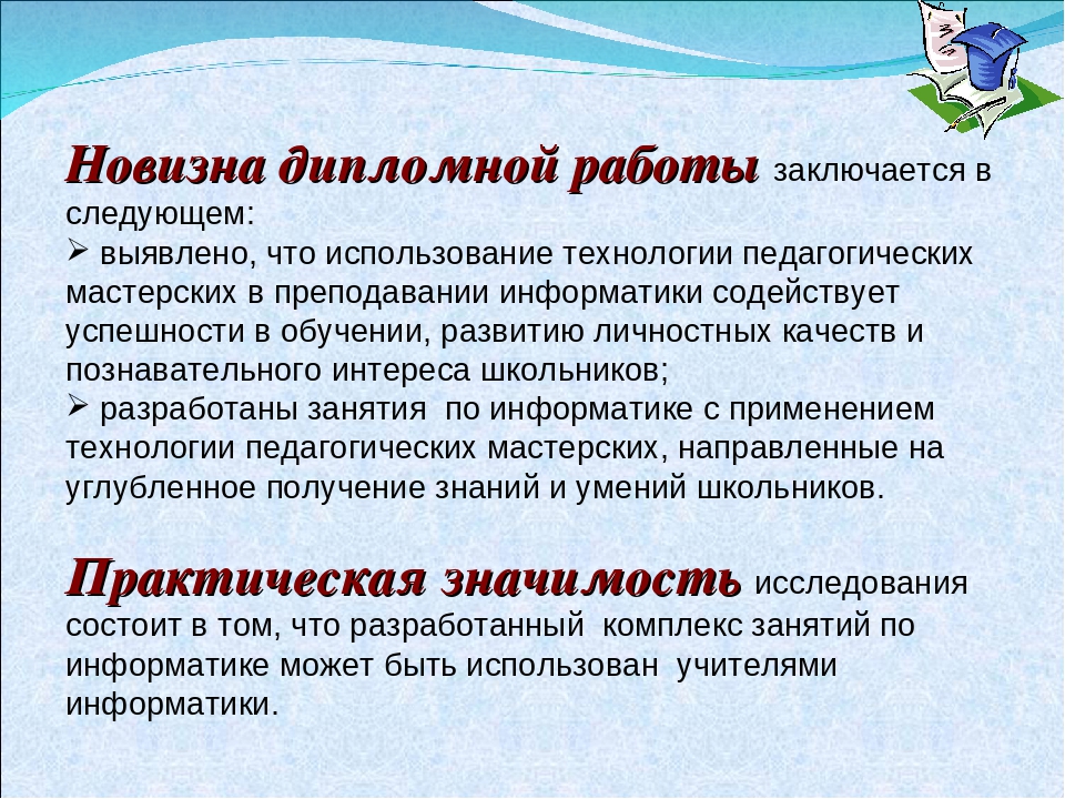 Научная новизна дипломного проекта не появляется на пустом месте, а является следствием колоссального умения систематизировать и обрабатывать справочную литературу, правильно выбирать метод исследования, анализировать полученные сведения и применять их на практике.