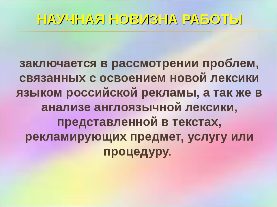 Тем не менее основные принципы для всех остаются одинаковыми. Существует огромное количество вариантов, при помощи которых может быть представлена научная новизна дипломной работы. Пример № 1 – нестандартный подход к изучению предмета. Пожалуй, именно его можно назвать одним из самых распространенных вариантов. Пример № 2 – изучение нестандартного аспекта предмета. Проще всего продемонстрировать данный метод в исследовании гуманитарного характера. При изучении литературного произведения, к примеру, можно опустить образную структуру, композицию или жанровую принадлежность, которым обычно уделяется наибольшее внимание и сконцентрироваться на лексической структуре, синтаксисе или даже цветовой гамме. В качестве предмета исследования может быть избранно что угодно, начиная от собственных имен, заканчивая упоминаниями в тексте музыкальных композиций.
