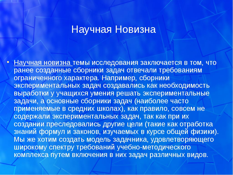 В первом случае научную новизну следует рассматривать, как разницу в уровне преобладающих знаний и умении ими воспользоваться на практике; при этом целесообразно каждый раз усложнять задачу и подбирать новый этап обучения.