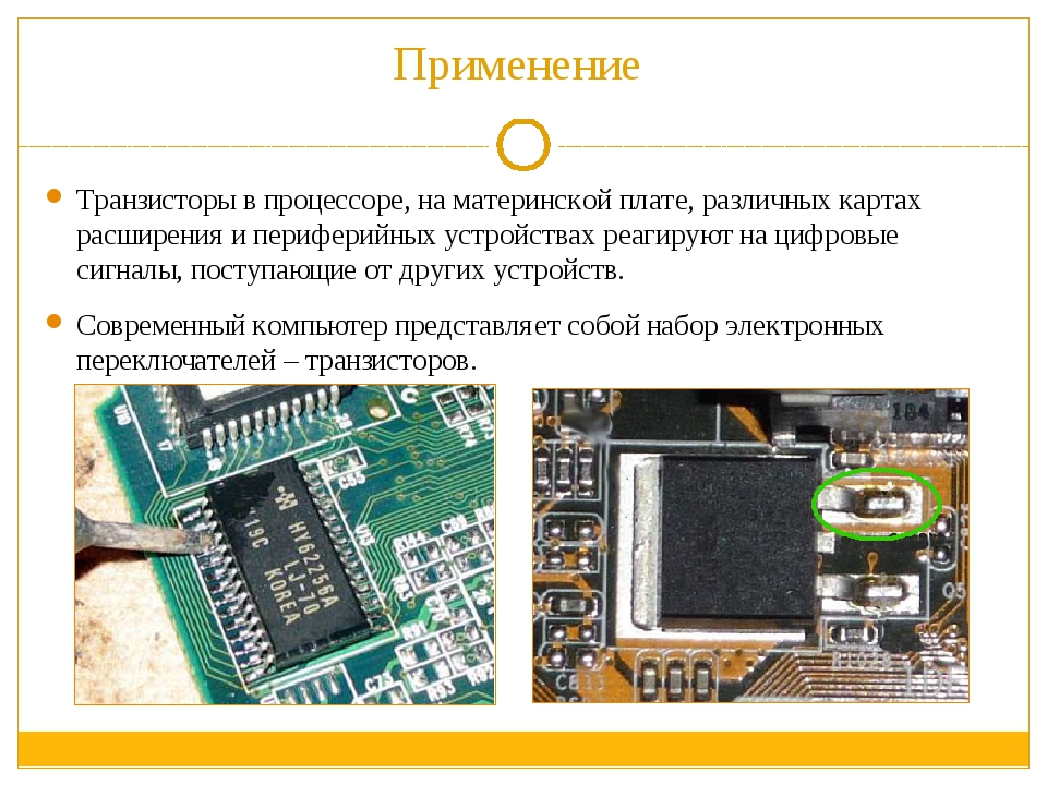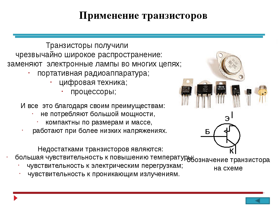 Используются транзисторы в усилительных схемах, лампах, электродвигателях и других приборах где необходимо быстрое изменение силы тока или положение вклвыкл. Транзистор умеет ограничивать силу тока либо плавно, либо методом импульс—пауза.