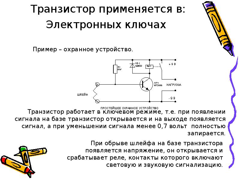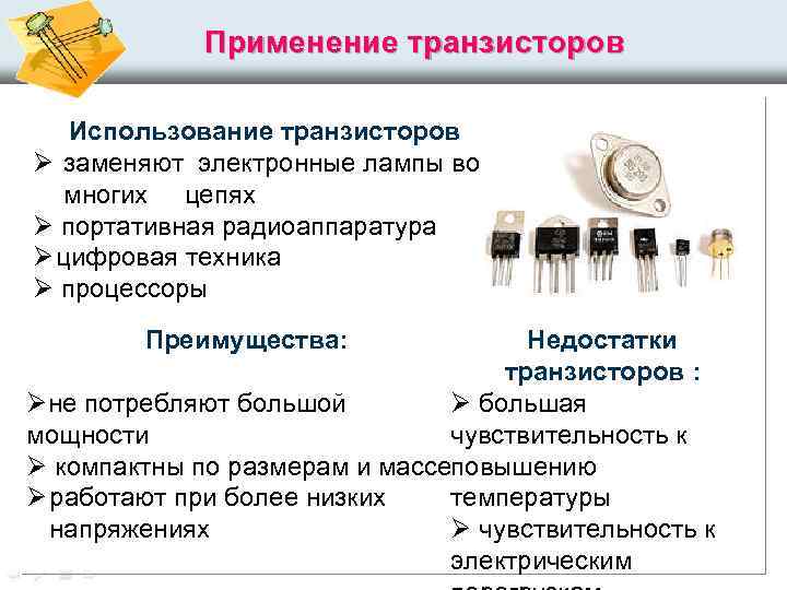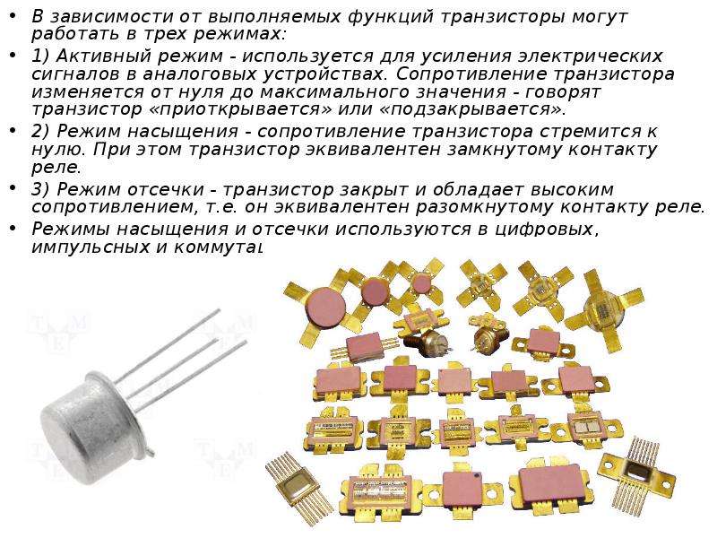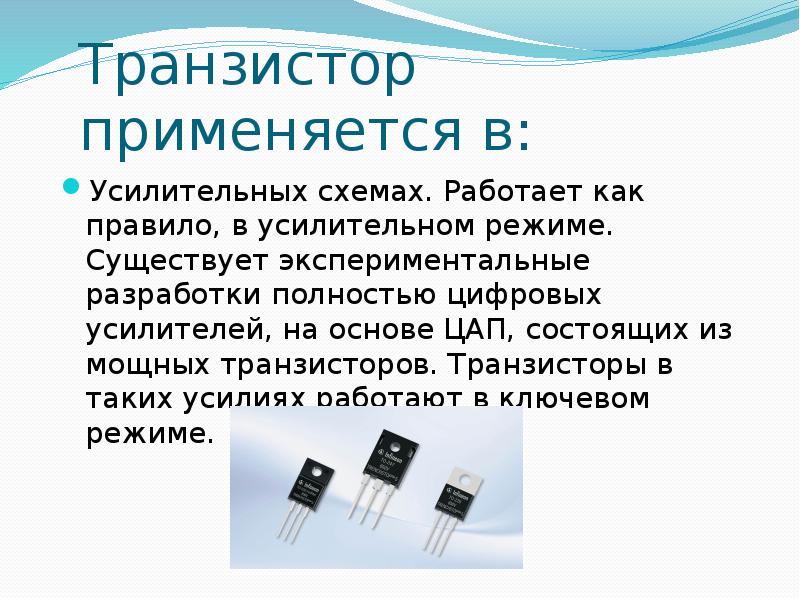 Пример: В схемах усилителей, передатчиков и приемников транзисторы используются для усиления.