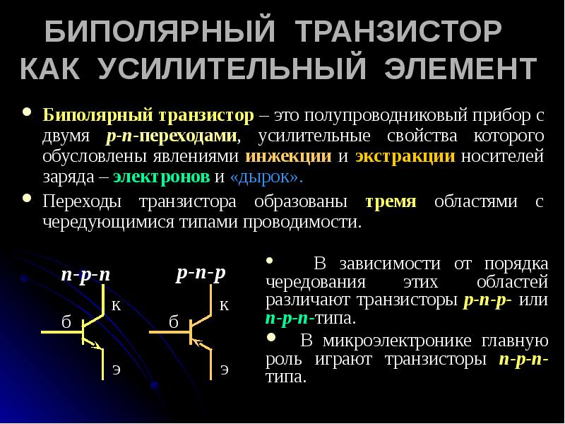Существуют разные типы транзисторов: биполярные и полярные, прямой и обратной проводимости. Тем не менее, в основе работы этих приборов лежит один и тот же принцип.