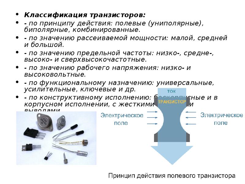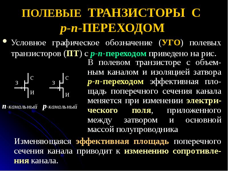 Полевые транзисторы – распротранёные устройства в которых управление электрическим потоком происходит посредством электрического поля. То есть когда образуется большее поле – больше электронов захватываются им и не могут передать заряды дальше. То есть это своеобразный вентиль, который может менять количество передаваемого заряда (если полевой транзистор с управляемым p—n—переходом). Отличительной особенностью данных транзисторов являются высокое входное напряжение и высокий коэффициент усиления по напряжению.