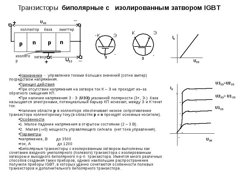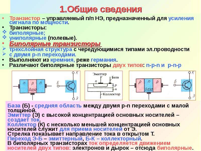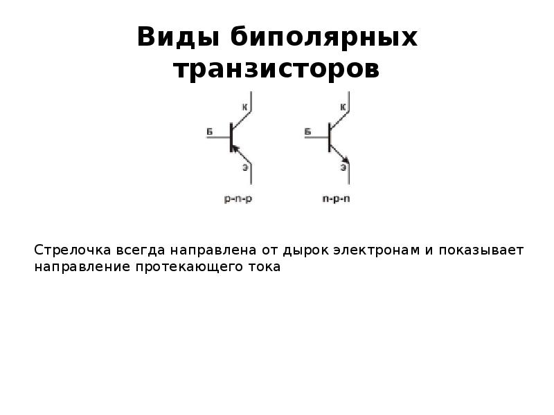 Биполярные – транзисторы в которых носителями зарядов могут быть как электроны, так и «дырки». Ток может течь, как в сторону эмиттера, так и в сторону коллектора.