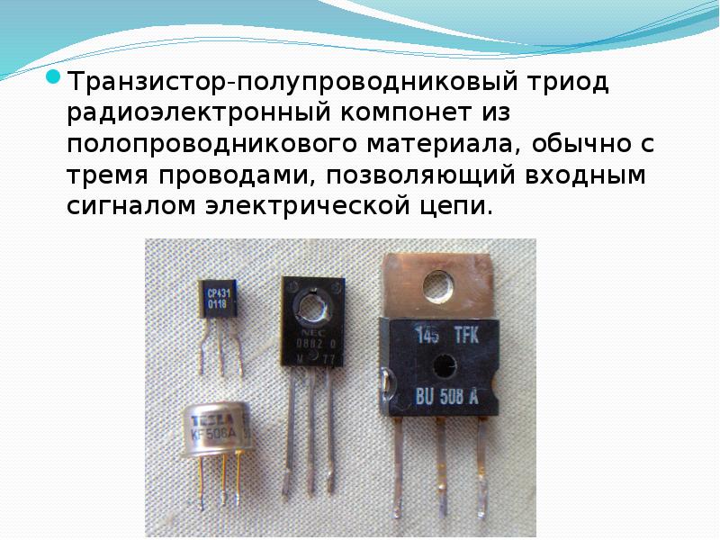 Транзистор (transistor) – полупроводниковый элемент с тремя выводами (обычно), на один из которых (коллектор) подаётся сильный ток, а на другой (база) подаётся слабый (управляющий ток). При определённой силе управляющего тока, как бы «открывается клапан» и ток с коллектора начинает течь на третий вывод (эмиттер).