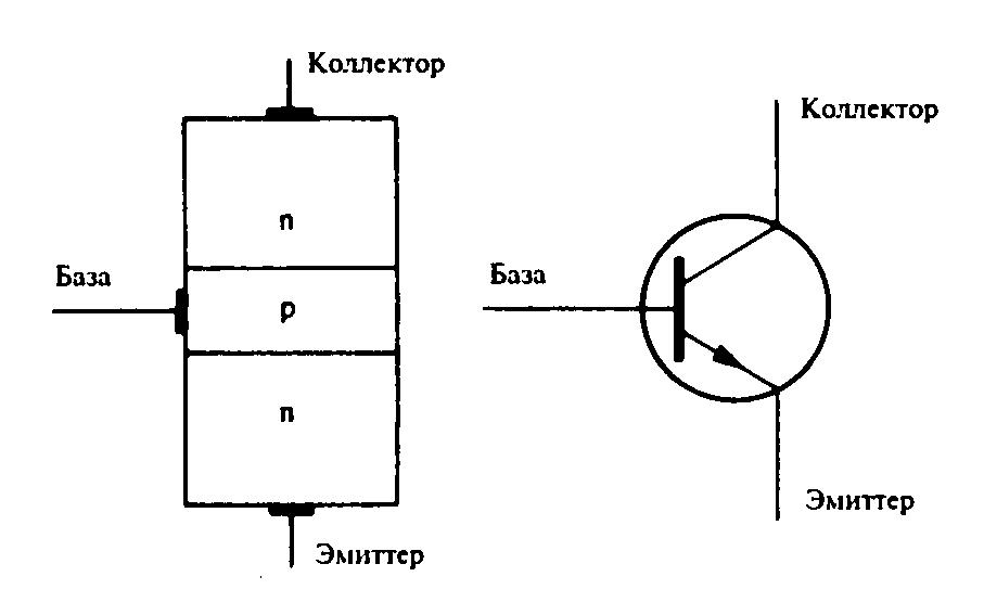 Биполярный транзистор (далее – просто транзистор) представляет собой кристалл полупроводника (чаще всего используется кремний или германий), разделенный на три зоны с разной электропроводностью. Зоны называются соответственно коллектором, базой и эмиттером. Устройство транзистора и его схематическое изображение показаны на рисунке ни же