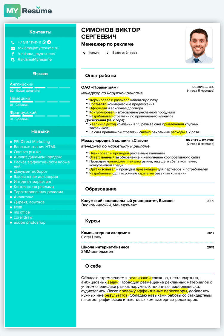 Существуют основные пункты, которые обязательно должны быть прописаны. Указывайте сильные стороны в резюме, избегайте лишнего, только информативность. Резюме – это краткий вывод умений и качеств. С первых строк покажите, что являетесь человеком с серьезным характером, настроенным на результат.