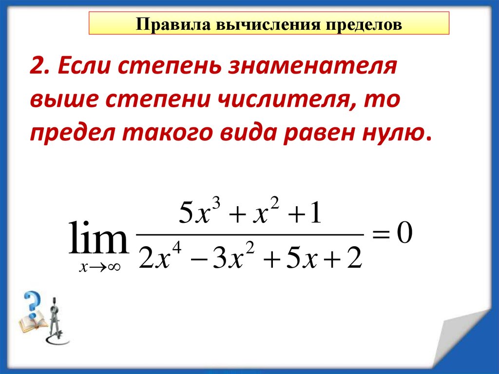 2) деление числителя и знаменателя на старшую степень аргумента (для отношения многочленов при x®¥)