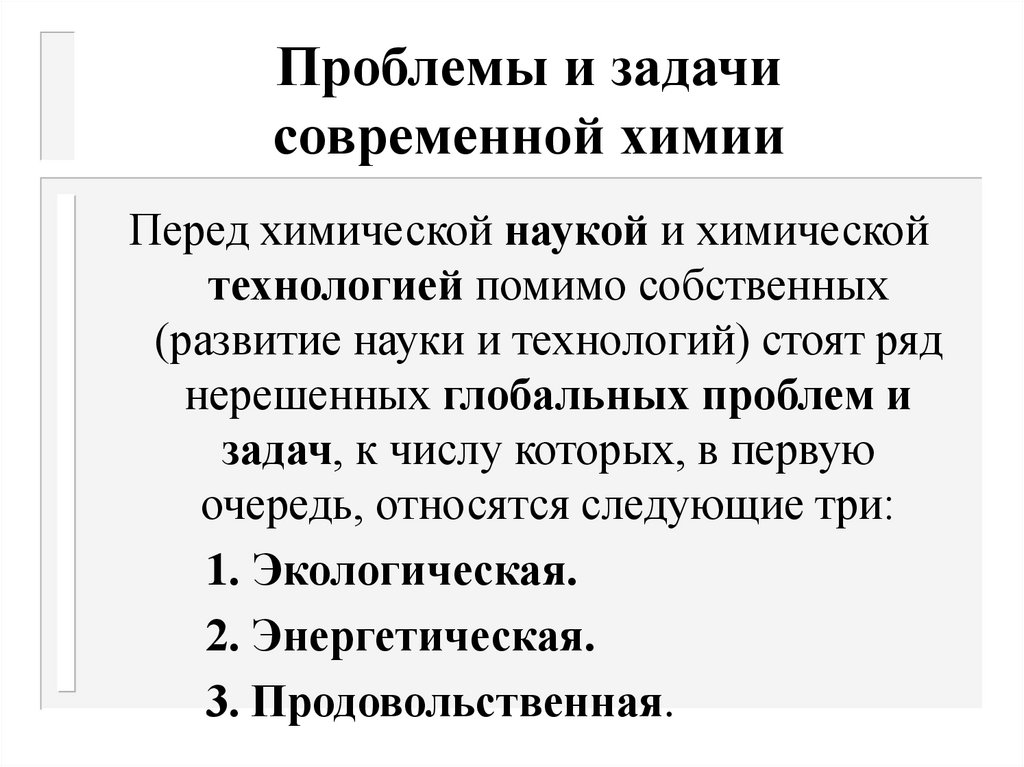 К нерешенным проблемам химии чаще всего отноятся вопросы типа: «Можно ли создать химическое соединение Х», «Можно ли его разложить?», «Можно ли очистить его от примесей?» и т. д. Подобные проблемы обычно решаются достаточно быстро.