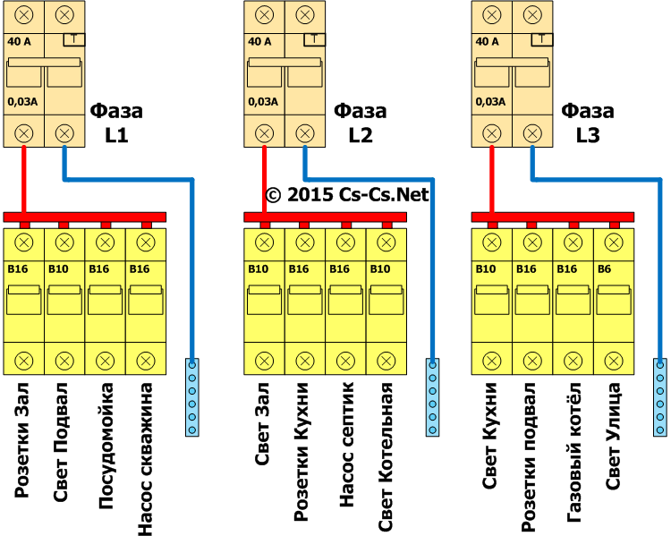 В случае, когда максимальная нагрузка предположительно равняется 15кВт, для провода одной фазы величина проходящего тока составит 70A. Следовательно, обязательной будет прокладка медного провода с 10-милиметровым сечением и силового автоматического выключателя. Однако стоимость такой сети намного дороже. А потому выходом из ситуации может стать монтаж обычной трехфазной сети и распределение эффективной нагрузки поровну между фазами, то есть – по 5 кВт. На сегодняшний день подобные решения по обеспечению электропитанием используются большинством магазинов, предприятий и офисов.