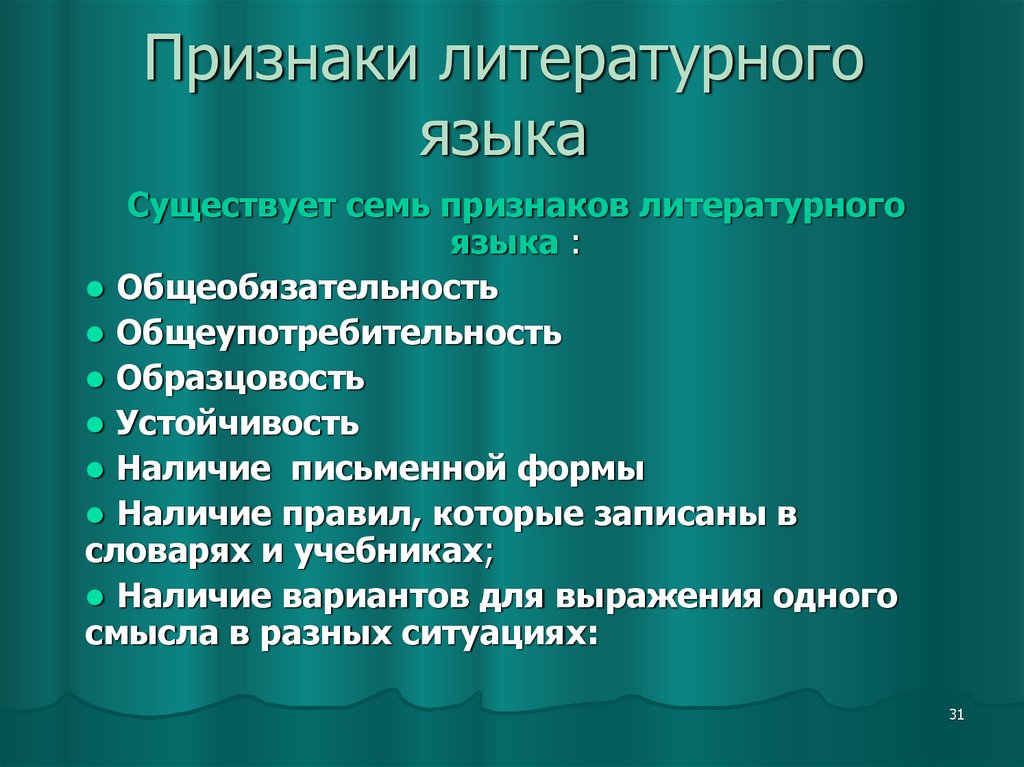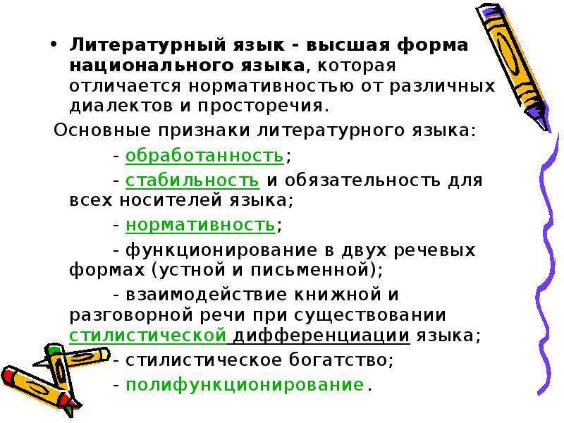 Литературный язык, наддиалектная подсистема (форма существования) национального языка, которая характеризуется такими чертами, как нормативность, кодифицированность, полифункциональность, стилистическая дифференцированность, высокий социальный престиж в среде носителей данного национального языка.