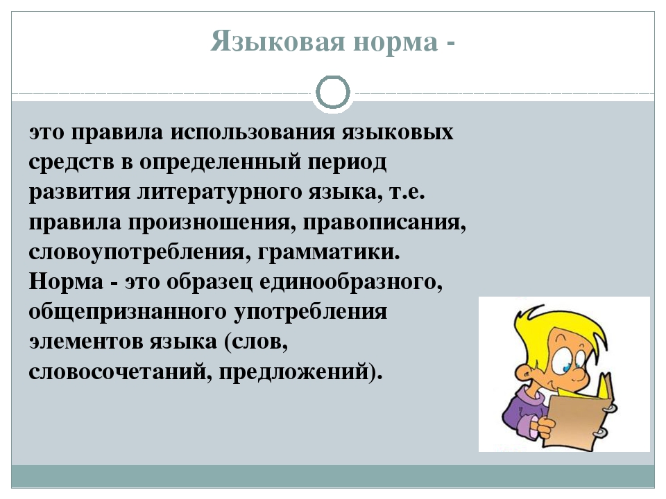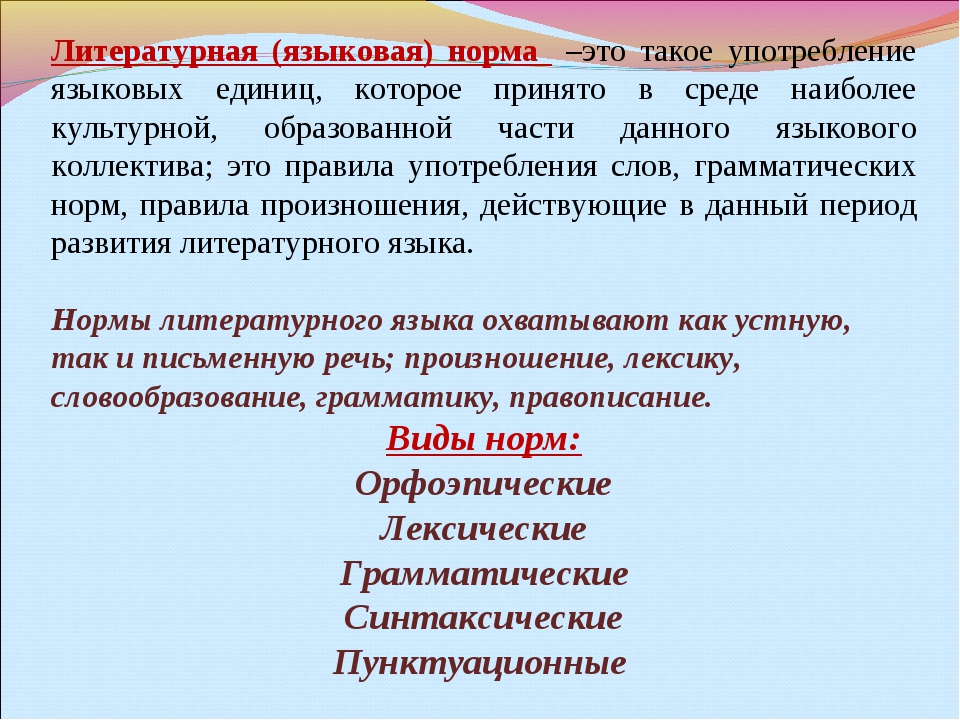 Виды языковых нормЯзыковая норма (норма литературного языка) — это совокупность традиционных правил, отобранных и закрепленных в процессе общественной коммуникации — общепринятые нормы устной и письменной речи для данной эпохи.